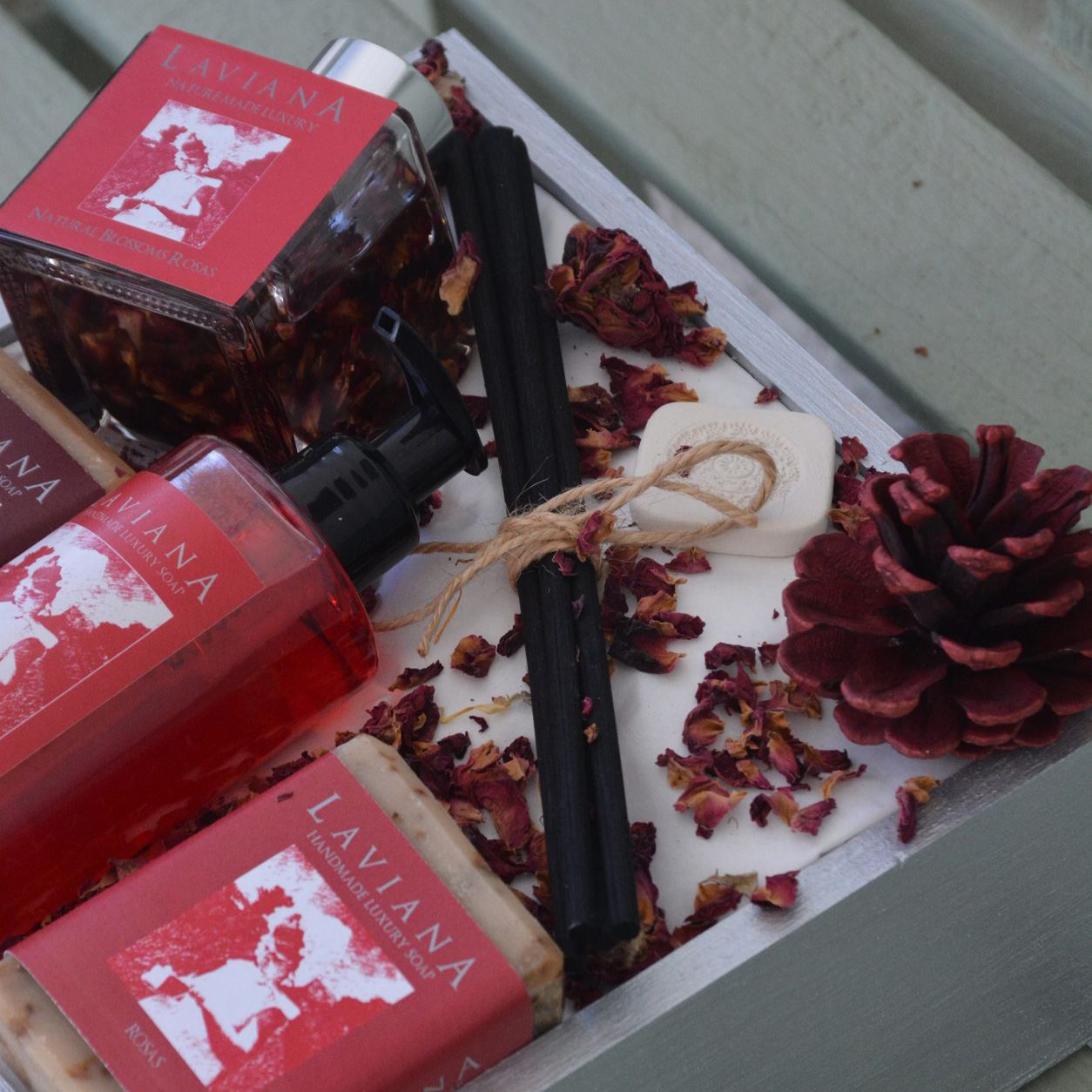 Nuestra Caja LAVIANA de cosmética natural, en acabado oro o plata, combina el encanto de los ingredientes naturales y el trabajo artesanal con detalles que evocan lujo, elegancia y sofisticación.